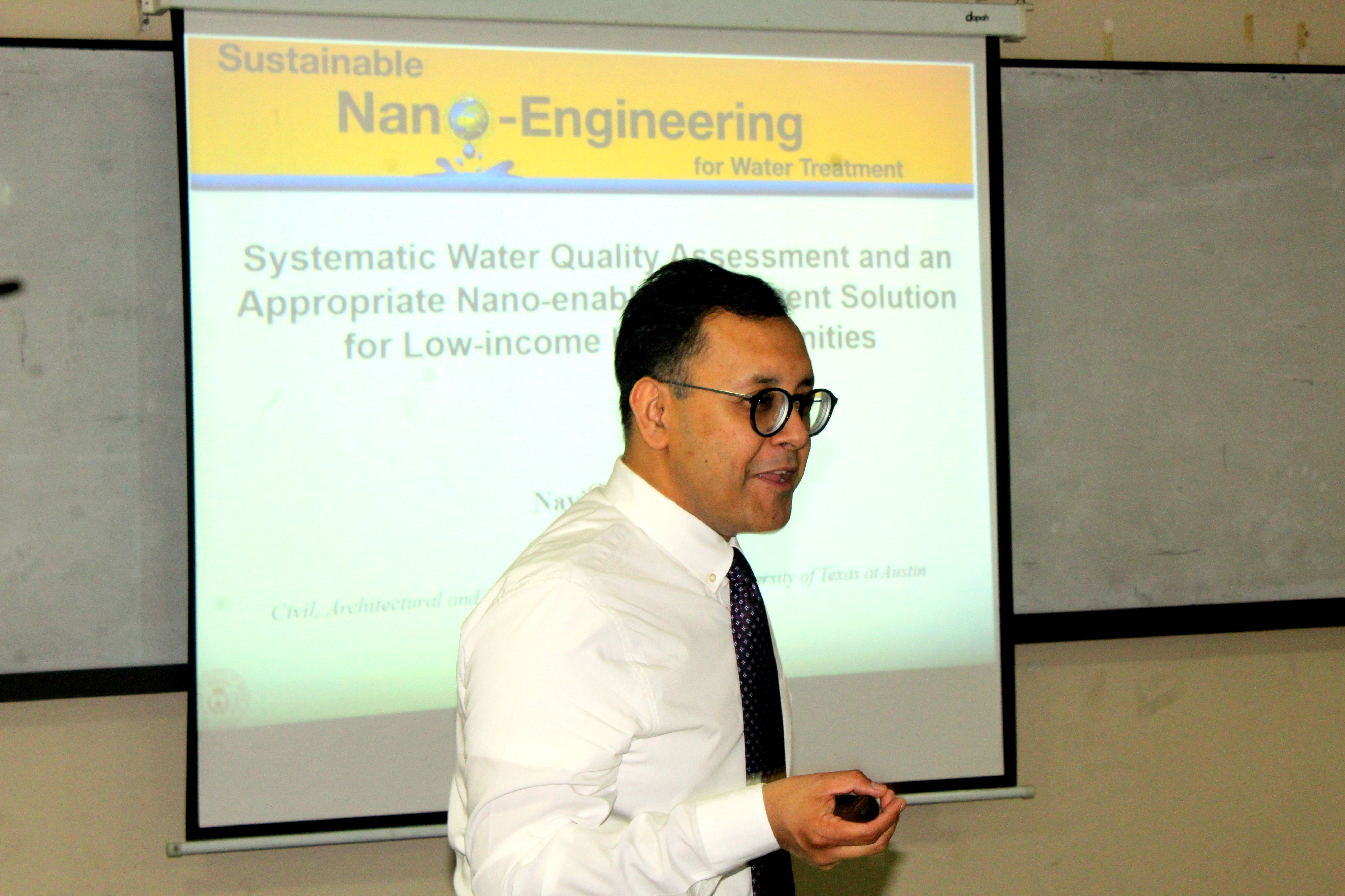 He shared his ongoing research on the probable adverse effect on water quality of Alaskan native communities due to global climate change. He also briefly presented inorganic and microbiological water quality in low-income communities of Texas commonly known as "colonias". Finally, the talk ended with a novel point-of-use treatment technology for disinfection that utilizes locally available materials and American Indian pottery.